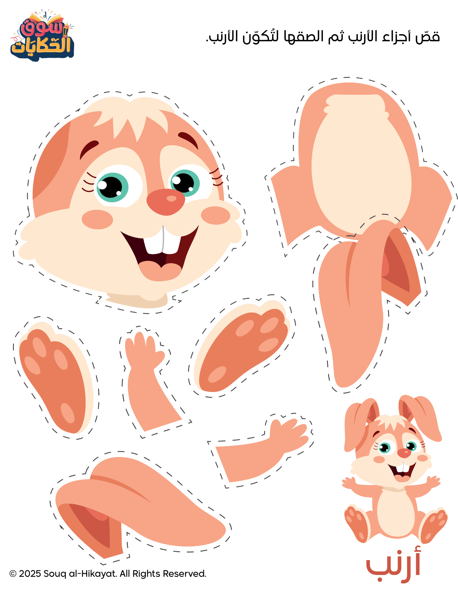 With this “Build a Bunny” craft worksheet, children will practice the letter Alif (ا) while cutting, gluing, coloring, and tracing. This interactive activity helps kids connect the sound of the letter with the word أرنبin an enjoyable way.