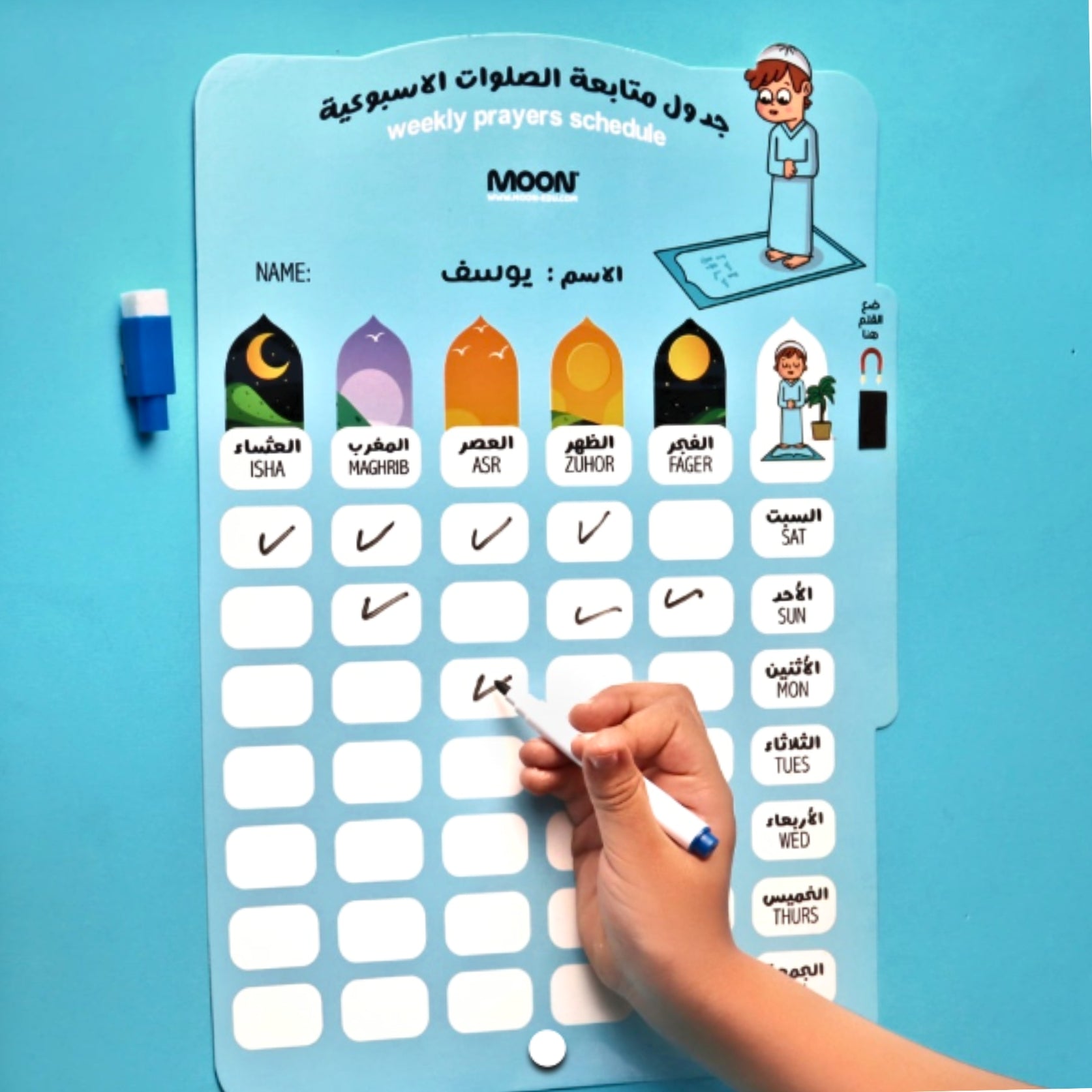 يساعد هذا الجدول الأطفال على تتبع صلواتهم اليومية بطريقة ممتعة وسهلة! مزود بقلم ماركر، يمكنهم كتابة الصلوات التي أدوها ثم مسحها بكل بساطة في بداية كل أسبوع. يجعل التعلم أكثر تفاعلية ويحفزهم على الاستمرار في أداء الصلاة بانتظام